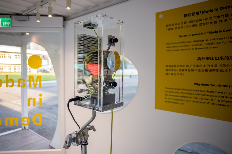展場中還有一個特別的相機互動裝置「Made in Democracy」,這個由Lightbox攝影圖書室發起的民主相機計畫,試圖打造一台從設計到所有零件完全在民主國家內製造的相機。在透明的壓克力盒中,相機的組件一覽無遺,象徵著過程的開放。觀眾按下快門後,會得到一張上下並列的影像:一半清晰、一半模糊,而在模糊的部分會印有關於民主的金句。