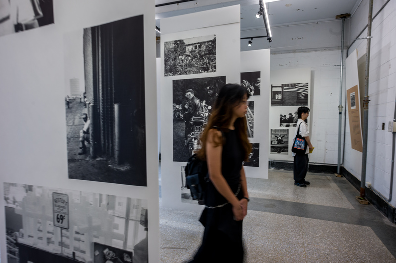 走進C-LAB的展場,觀眾看不到任何一張被玻璃相框裝裱保護的作品。從《美國人》(The Americans)時期的攝影經典到法蘭克晚年的攝影再探索與私密生活片段,全被數位輸出於大幅類似報紙的紙張上,再從天花板垂掛而下或直接貼在展板上,觀眾可以極近距離地觀看,感受油墨的氣味與紙張的纖維。