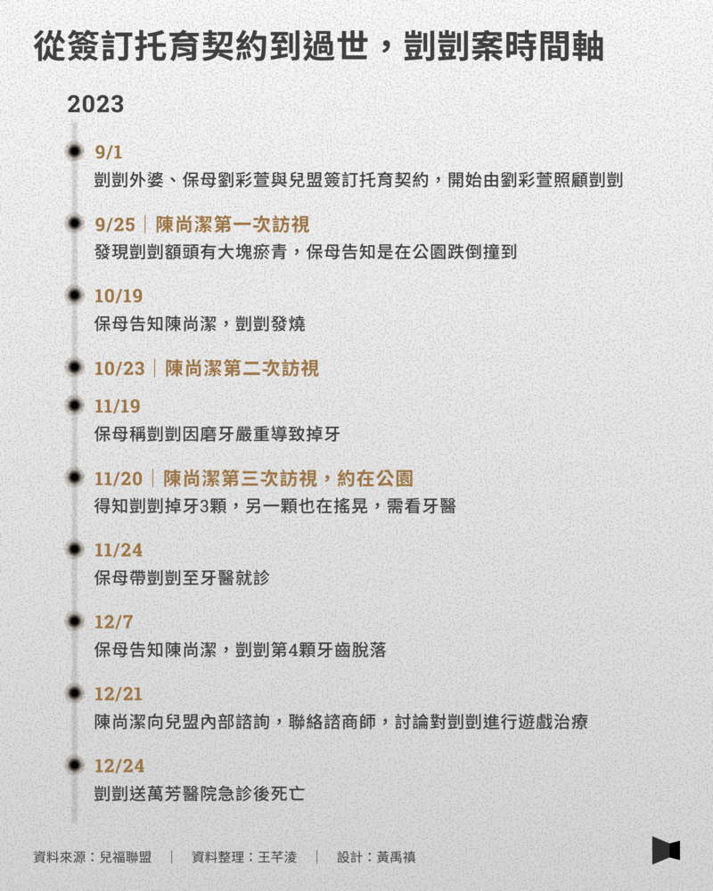 剴剴託給劉彩萱照顧3個月期間,陳尚潔曾經在2023年9月25日、10月23日、11月20日進行過3次例行的訪視。