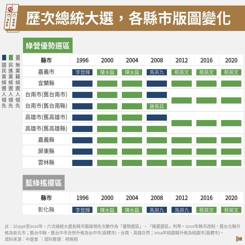 《報導者》以1996年至2016年、六次總統大選各縣市的藍綠陣營領先次數,作為「藍/綠優勢選區」、「搖擺選區」判準。可以觀察到1996年以來,花蓮縣、台東縣、金門縣、連江縣這四個縣市從未在總統大選被綠營翻轉過。2000年之後,雲林縣、嘉義縣、屏東縣、以及2010年縣市改制前的台南縣、高雄縣,改制後的台南市、高雄市,則皆由綠營拿下。