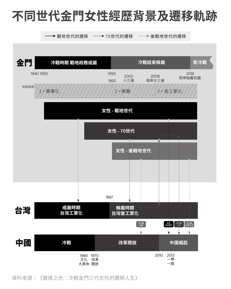 「後戰地世代」透過不同的教育軌徑進入到中國、台灣念書,到中國是因為人脈,加上對岸開始針對台籍子女進行整套的制度設計,設立單一窗口的服務機制,採取加分、獎學金、減免的措施,吸引台灣小學以上的學生進到中國。到台灣是透過離島保送,提供金門青年到台灣念大學的機會。她們離開家鄉,承載金門處於發展落差的壓力,進入商品化和競爭化的教育體系,回應兩岸三地的發展需要,經過社會化的歷程,她們從離島少女轉變為具有現代化和競爭力的專業儲備人力,局限在「女性化的產業」,被納入新冷戰下的競爭框架。
