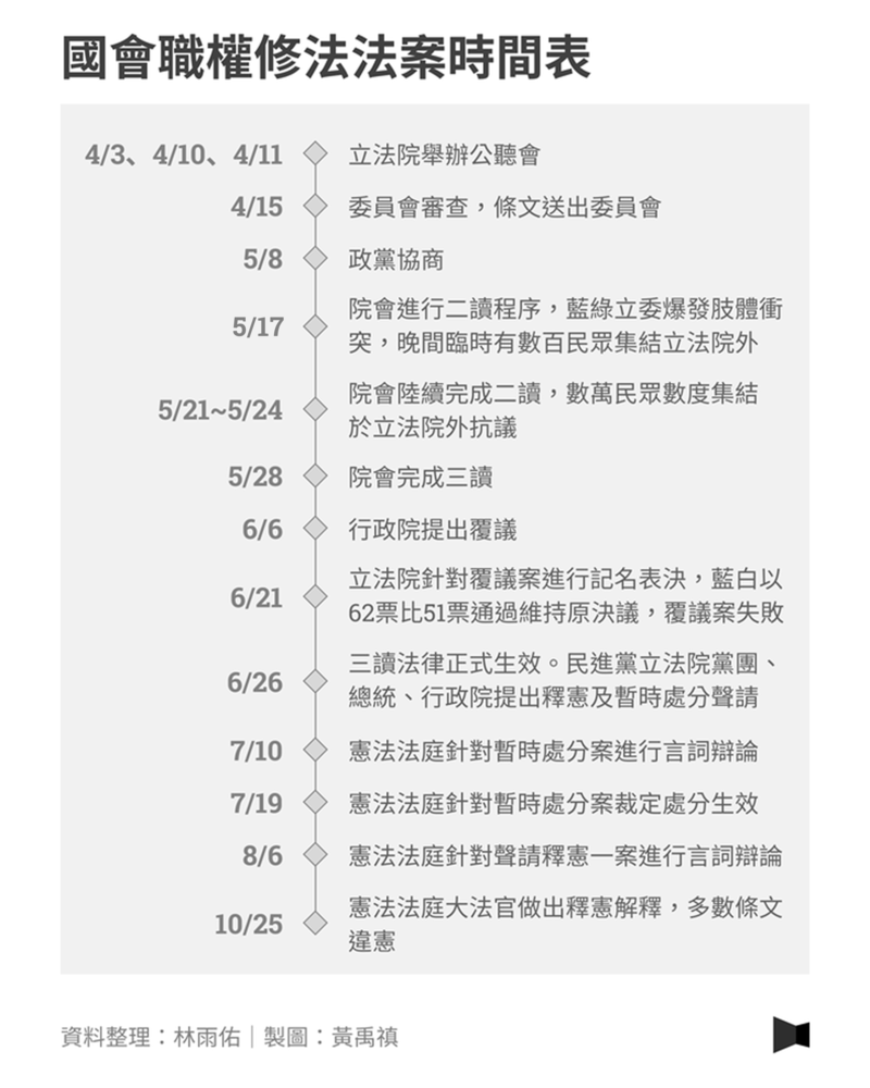 針對國會職權修法期間的「立法程序」爭議,憲法法庭判決主文寫道:「其立法程序雖存有瑕疵,惟整體而言,尚難謂已完全悖離憲法公開透明與討論原則之要求⋯⋯」由於未完全違背公開透明與討論原則,因此「不因立法程序瑕疵而牴觸憲法」,大法官仍是針對各法條的細節進行判決。