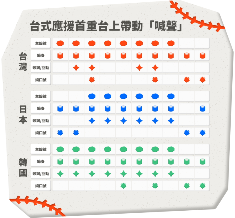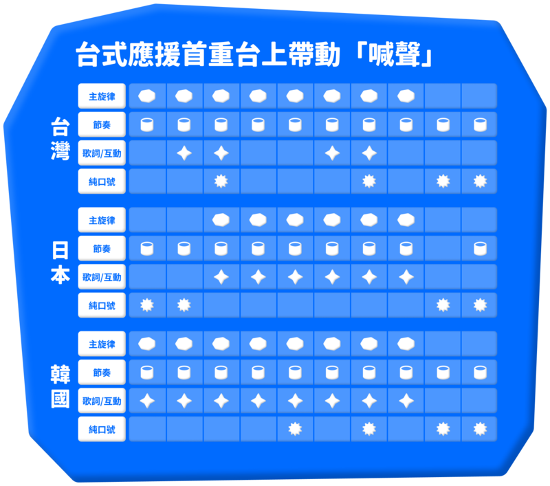 台灣對比日、韓兩國的最大差異也在此。日本球員應援曲通常會搭配一整段完整的「歌詞」,內容為球員量身打造,韓國雖和台灣類似,應援曲口號還更簡單,不過音樂進行間較少台上、台下的互動段落。