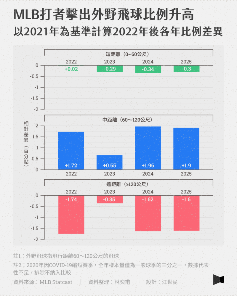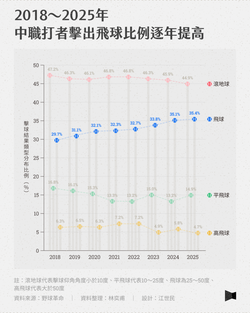 根據野球革命數據統計,近8年,中華職棒滾地球百分比從47.2%降至44.9%,飛球比例則是很明顯的從29.7%增加至35.4%,顯示中職打者正努力打出飛球,避免擊出滾地球。