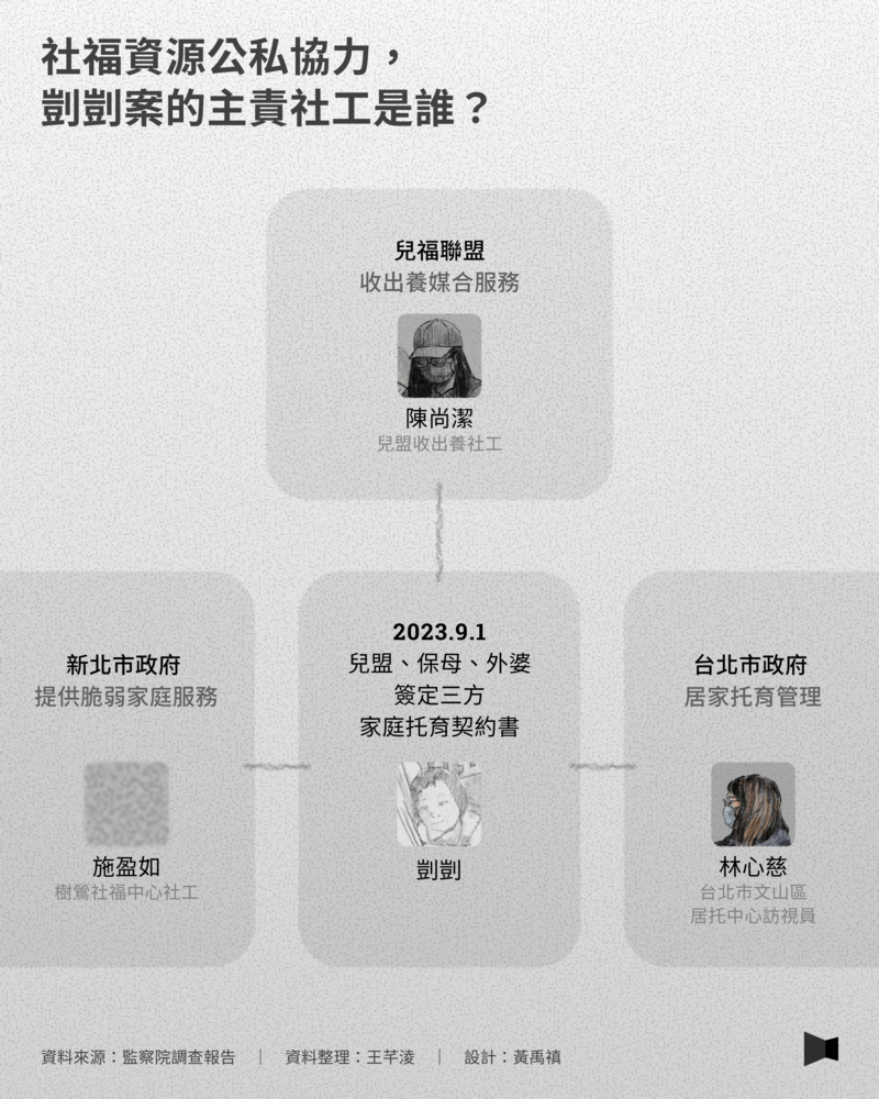 」是衛福部社會安全網的分工設計理念,但在剴剴案中,這套分工架構卻出現責任歸屬的模糊地帶──到底哪一位社工該負起責任? 本案中由3個單位建構剴剴的支援網絡:樹鶯社福中心社工施盈如負責整合剴剴原生家庭所需資源;兒盟社工陳尚潔負責收出養媒合服務;文山居托中心訪視輔導員是為保母(托育人員)與家長提供專業連結的關鍵角色。他們持有幼保、社工或護理專業,負責定期訪視保母家、考核托育環境、提供教保諮詢、處理家長申訴,並對高風險案例提高頻率訪視,確保受托兒童的居家照顧品質與安全。