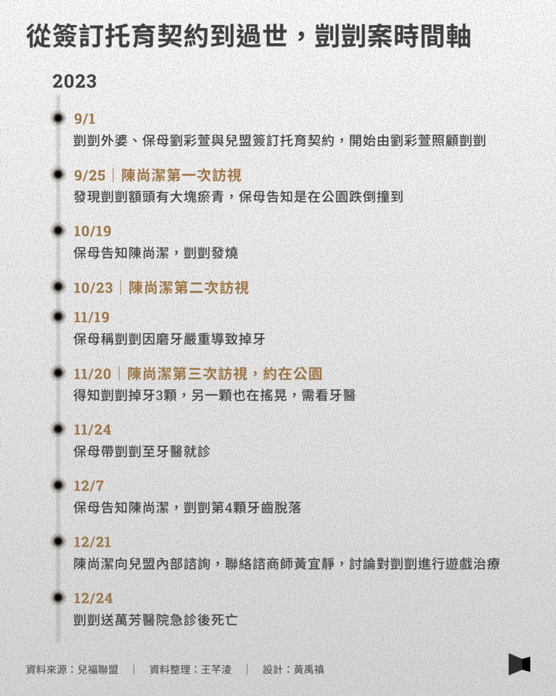 」,服務對象是剴剴原生家庭,包括其外婆尚在撫養中的未成年子女。更關鍵的是,相較承接收出養業務的民間單位兒福聯盟,公部門的社福中心社工完全沒有保母的聯繫管道。 被告在2月23日接受訊問時曾說:「劉童轉介到兒福聯盟之後,施盈如說她的單位(樹鶯社福中心)沒有要求要去訪視,我當下表示了解,因為在網絡合作當中,確實有些主責社工也是仰賴其他社工去訪視而(對個案狀況)做了解。因為施盈如說她沒有要訪視,所以我就沒有把劉彩萱的資訊提供給她 。」