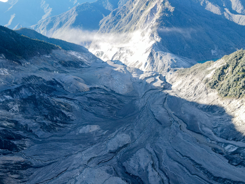 早上8點,我們來到主流邊的河階崖邊,不到兩週前的溢流事件,已經讓主流河道刷深超過百米,如果走到河階邊緣,會發現許多裂隙正在發展,不小心踩到有時還有陷落的狀況;每條裂隙的長度、寬度不一,說明著崩積土砂下方複雜的組成,也說明了這是持續在變動的地形。我們在這裡放飛無人機,打算記錄溢流處下游的地景,但遺憾沒有趕上粉塵逸散前的時程,鏡頭裡只有粉塵反射後過曝的光線,並無法讓無人機透過「鳥」的視角,把堰塞湖最關鍵區位的影像帶回來。