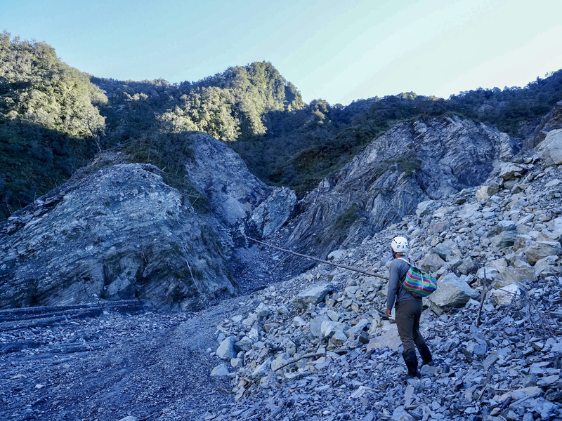 垂降之後,首先走上海拔1,350公尺高的崩積台地,這裡是崩塌發生時側向刮痕位置,讓每一條原本能走下馬太鞍溪的稜線都變成斷頭稜,有至少50公尺高的巨大落差,讓我們沒有辦法如熟悉的登山經驗沿稜線下切。這裡的板岩還沒有發生太多搬運作用,邊緣十分鋒利,粒徑也明顯大於崩積河階接近馬太鞍主流的區域。有隊員在一個不小心之中掛彩,讓左小腿的脛骨附近流了一些血。行走在這裡,偶爾可以聞到檜木的香味,那是原本長在稜線上,被崩塌土石掩埋的樹木。