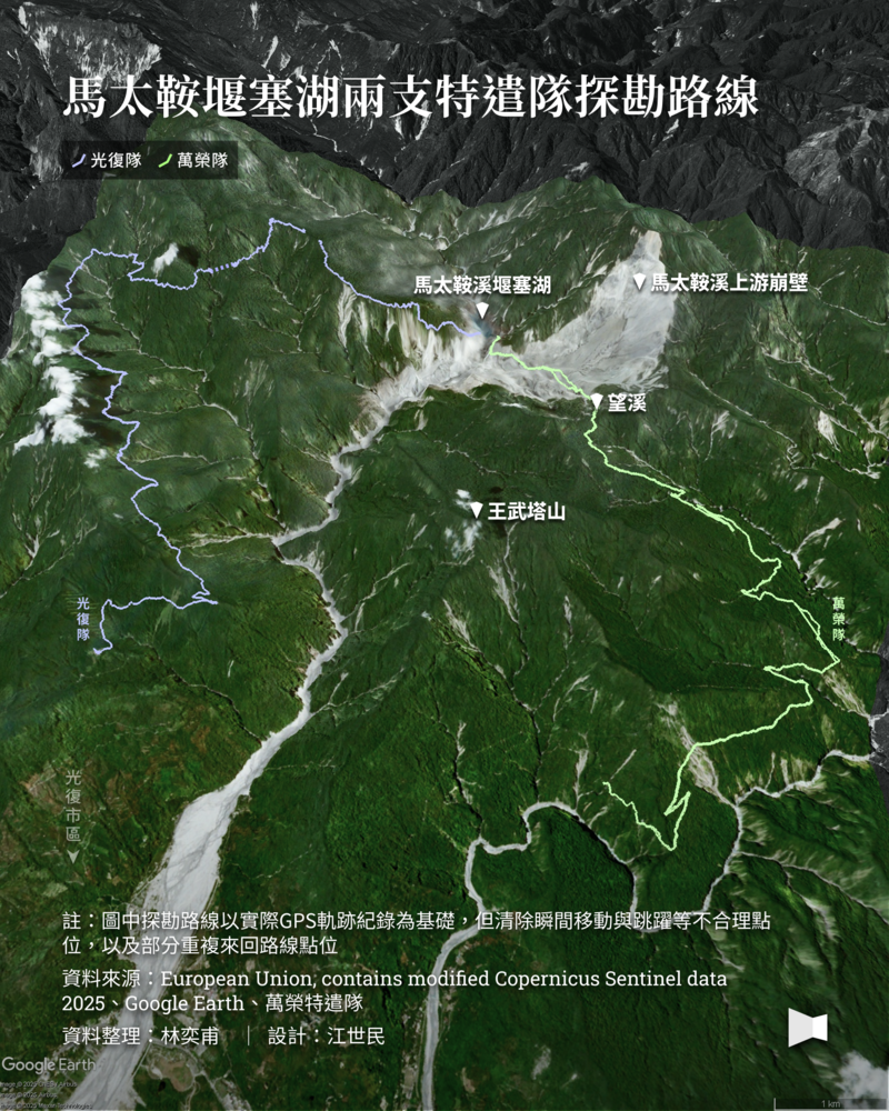 因此林保署透過中華民國山難救助協會東區搜救委員會(簡稱東搜)還有其他山域好手的協助,期望開闢一條安全的步徑抵達堰塞湖區,讓專家學者未來能夠不受到空中條件的限制,進行監測研究;此外,相關監測儀器(例如微地動儀)資料傳輸需要的訊號點位,也需要透過此次任務一併記錄,讓未來堰塞湖區現場的資料能夠快速傳輸,提供反應時間。林保署與我們從8月開始籌備開闢抵達湖區路徑的探勘行程,但7月21日的崩塌事件與9月23日的溢流事件後,現場地形劇烈改變,讓原本的地形圖在現場已經不具參考價值,而增加了任務的風險與挑戰性。