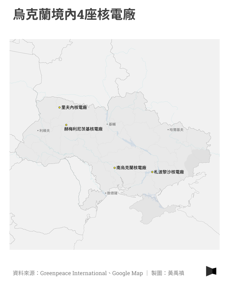 烏克蘭的核電廠營運商Energoatom負責境內共4座的核電廠,包含全歐裝置容量最大、支撐烏克蘭20%用電的札波黎沙核電廠(Zaporizhzhya NPP,以下稱ZNPP),另外還有南烏克蘭核電廠(South-Ukraine NPP)、里夫內核電廠(Rivne NPP)和赫梅利尼茨基核電廠(Khmelnytskyi NPP)。