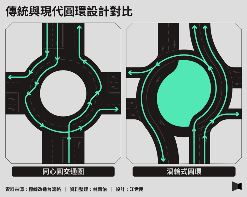 在〈全台圓環大體檢(上):哪些圓環頻傳傷亡事故?癥結怎解?〉報導中,我們分析台灣現有圓環存在的3大未改善的問題與案例。接下來,將介紹全台近年來的新圓環設計,也從數據來初步檢驗這些新圓環是否達到提升安全效果、改善哪些類型事故,作為其他路口改良的參考。