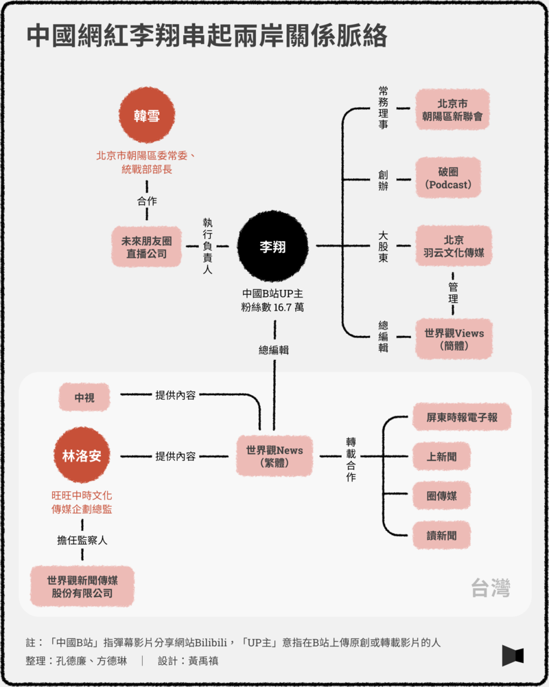 在「館長」陳之漢2025年首次中國行裡現身的網紅李翔,表面上是評論國際局勢的創作者,背後卻同時連結媒體平台、統戰組織與跨境內容網絡。《報導者》調查發現,以他為核心的「世界觀」體系,透過中國網站、節目與社群帳號持續產出內容,並進一步與部分台灣媒體內容合作,企圖擴散影響力。